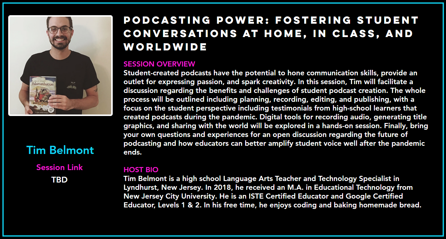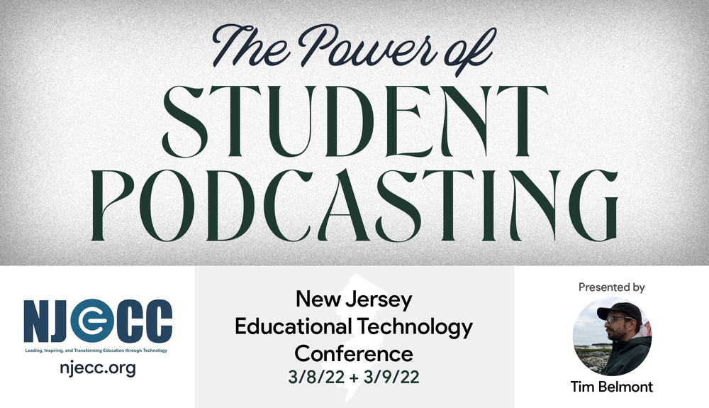 - 3/8/22: NJECC NJ Educational Technology Conference 2022 - The Power of Student Podcasting (Montclair, NJ)